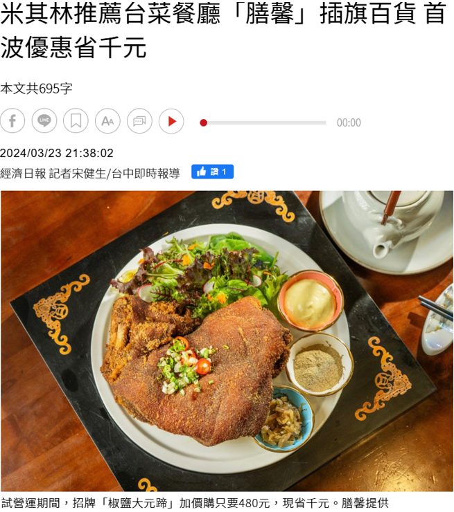 經濟日報|米其林推薦台菜餐廳「膳馨」插旗百貨