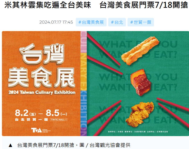 匯集全台廚師和冠軍美食的台灣美食展,8月2日至5日於台北世貿一館登場,主辦單位台灣觀光協會表示,門票即將於明(18)開賣!集結全台各地米其林必比登推薦餐廳、在地美食、物產、新鮮食材和金牌廚師,規劃「金牌特物」、「探索台味」、「異國美食」和「藝鳴驚人」四大展區...more