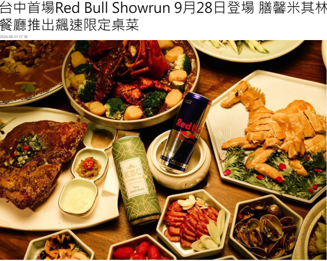 9月28日,台中市將迎來台灣首場Red Bull Showrun,市政路將封街,化身為一條充滿速度與激情的賽道。屆時,國際頂尖車手將在此展示直線飆速與過彎甩尾等高超技巧,現場觀眾可近距離感受賽車的震撼與魅力。位於市政路的米其林台菜餐廳膳馨,特別推出「Energy UP!一馬當先」飆速限定桌菜,價格為16888元...more