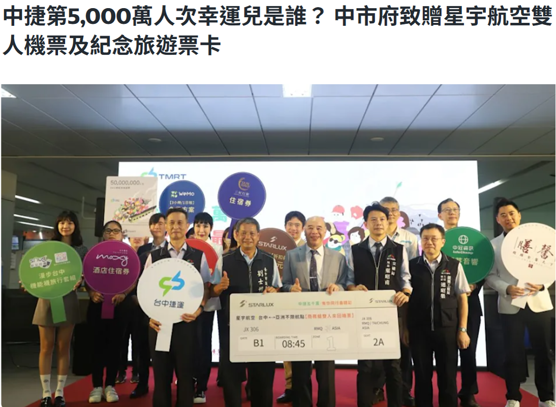 台中捷運綠線通車,邁入第5年,運量不斷成長,預計6月份將突破5,000萬人次,中捷公司董事長顏邦傑今天(3日)宣布,推出運量突破5,000萬人次慶祝活動,內容包括「第5,000萬人次幸運旅客送星宇航空機票」...「食」包含屋馬燒肉雙人套餐兌換券、膳馨餐飲集團招牌菜及「馨苑」個人套餐兌換券;「衣」包含sNug 高級機能襪組...more