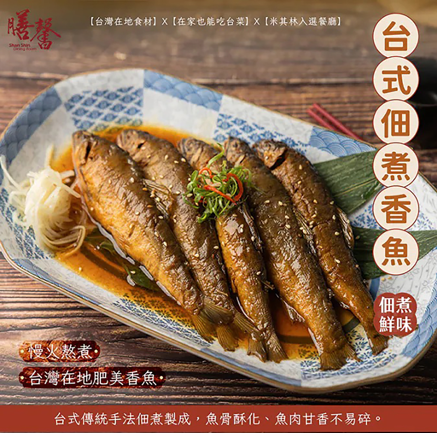主要成分:香魚、蔥、薑、水、糖、醬油、酒、醋、鹽、味霖、高鮮味素(L-麩酸鈉、胺基乙酸、DL-胺基丙酸、琥珀酸二鈉、5,-次黃嘌呤核苷磷酸二鈉、5,-鳥嘌呤核苷磷酸二鈉)。