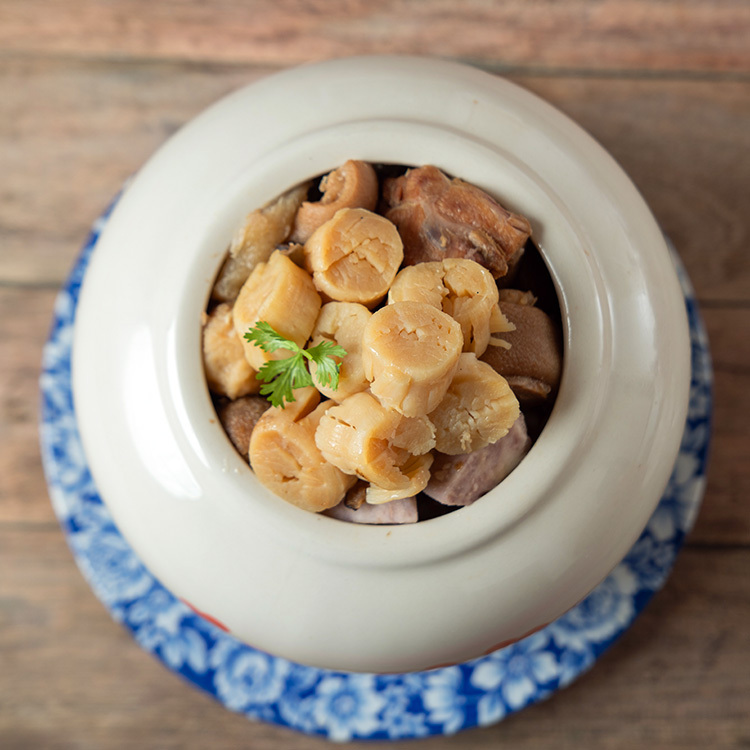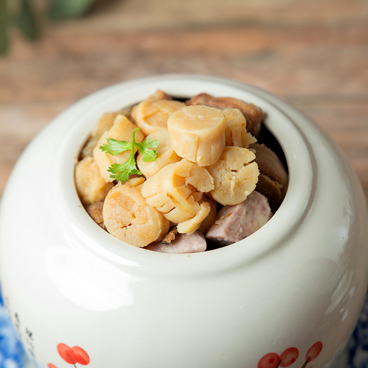 精選多款台灣在地豐富食材,經由泡、煮、炒、炸、滷、煨、燜、蒸、燉等繁瑣步驟,細心慢工調理每道食材,將其融入長時間文火淬煉的獨門濃郁上湯,最後加入參茸酒提升整體氣味,不僅讓干貝佛跳牆這道料理香氣醇厚,裡面每樣食材還保有原始風味,也使得湯頭堆疊出鮮濃甘醇極佳口味!